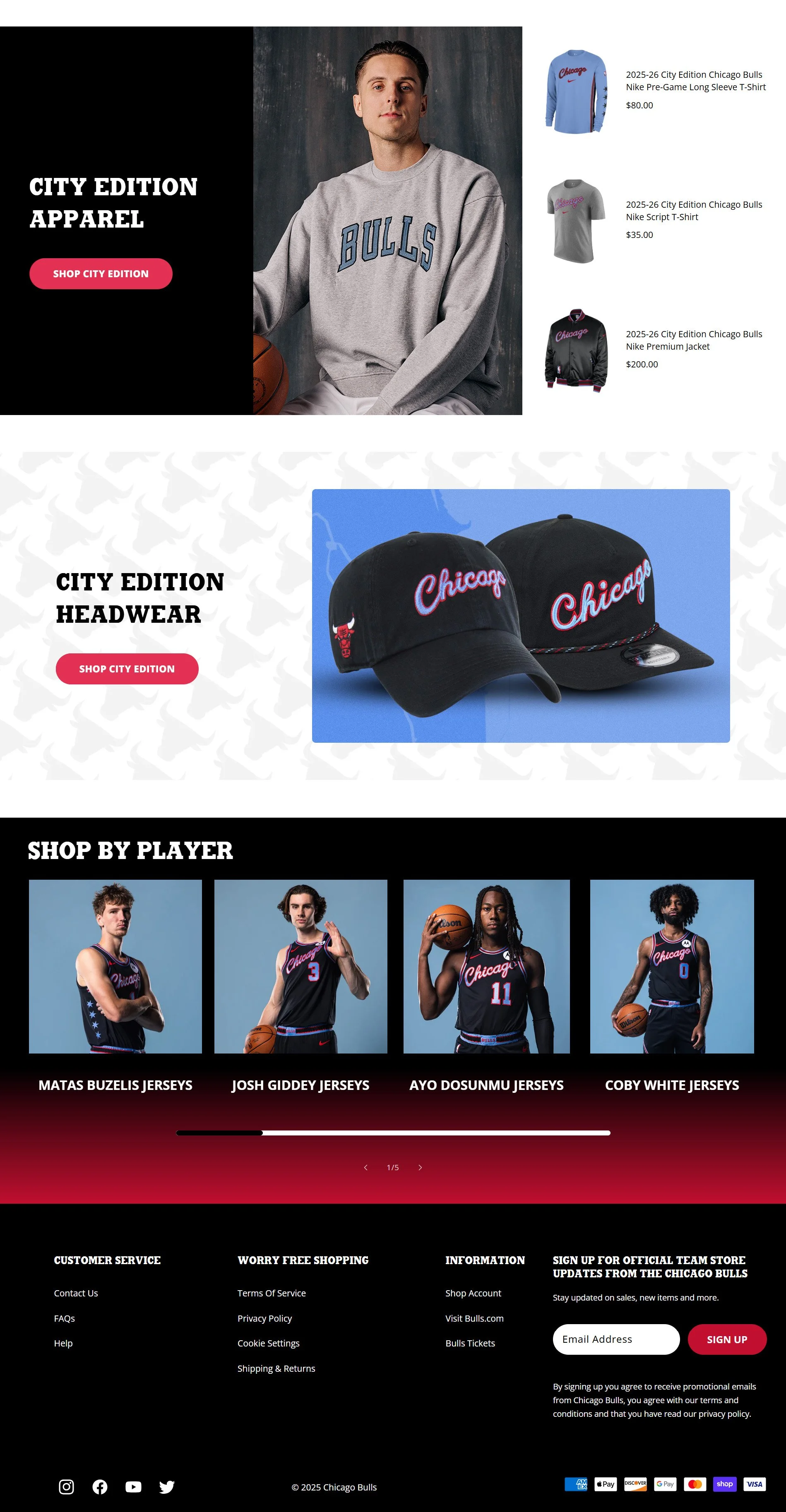 For the Chicago Bulls Gear Store’s 2025–26 City Edition launch, I developed a variety of digital marketing assets built around the collection’s unique visual identity. This included campaign graphics that promoted jerseys, lifestyle apparel, and other products while capturing the distinct energy of the City Edition collection. I also created a series of promotional emails, which involved concepting hero visuals, selecting product photography, and crafting engaging copy layouts to balance fresh branding with clear conversion goals.
