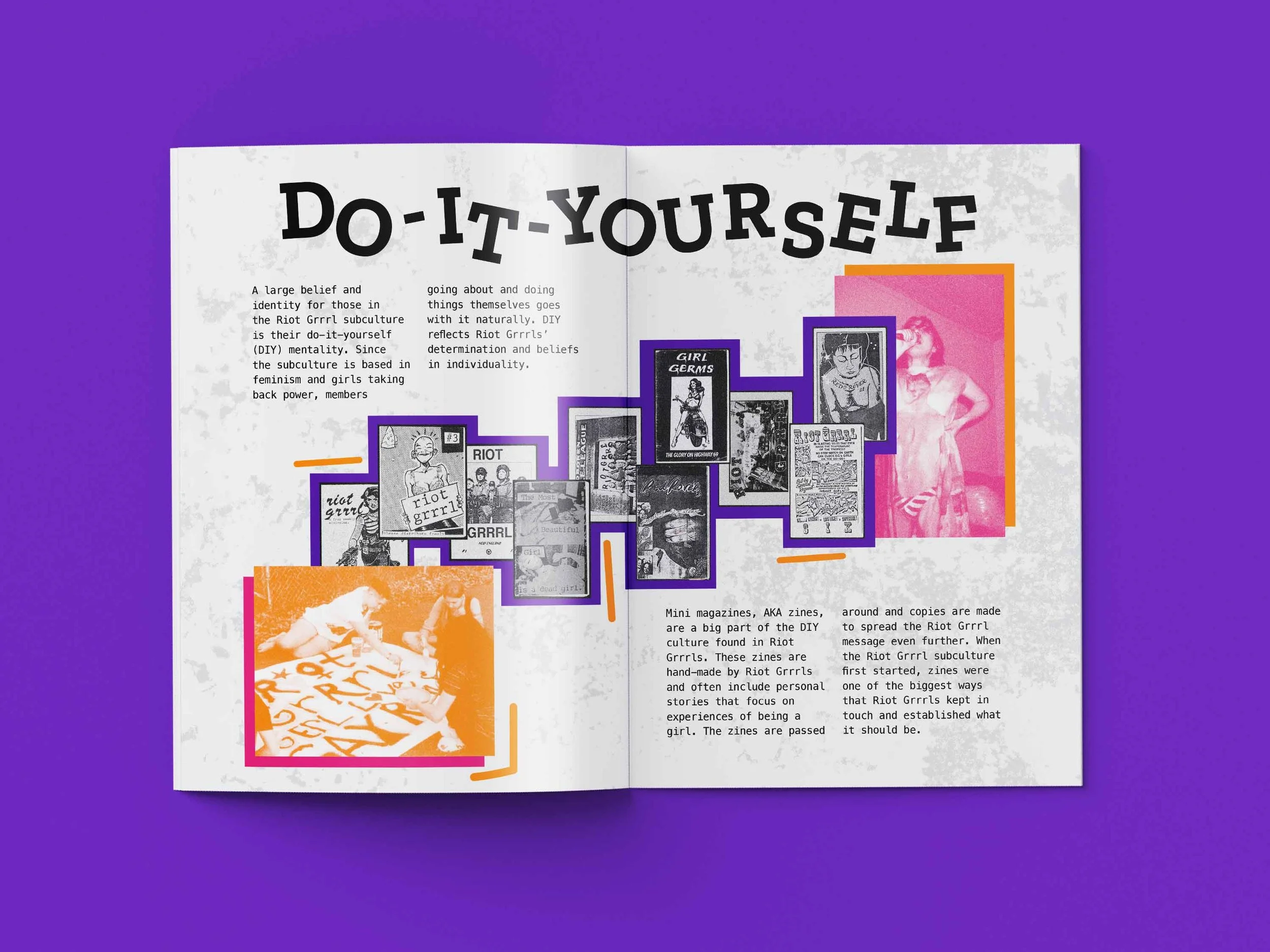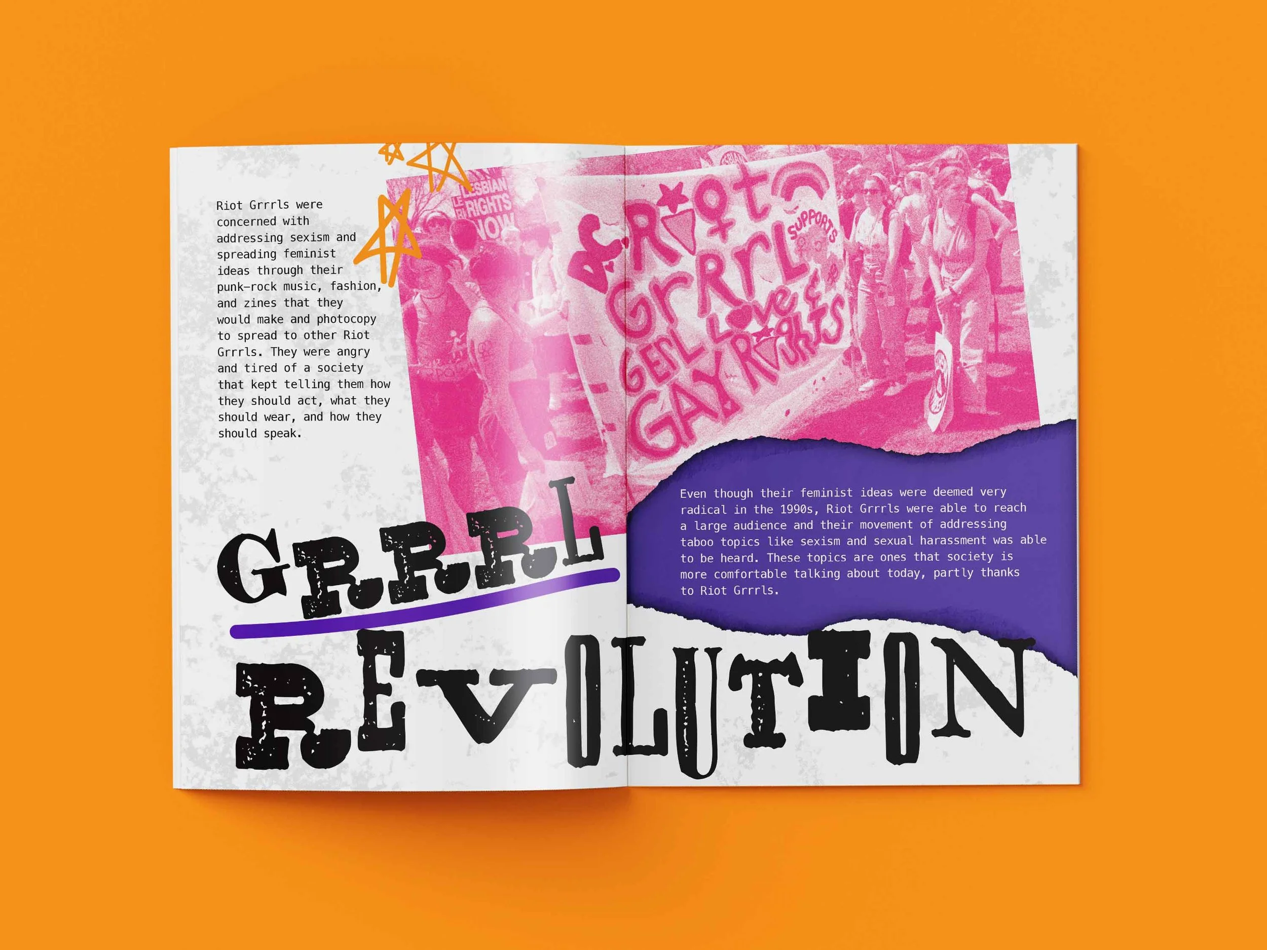 The design of the booklet draws directly from those original zines, which were handmade, imperfect, and deeply personal. To reflect that aesthetic and attitude, the piece features hand-drawn doodles, rough-cut photos, paper textures, and a mix of expressive typefaces inspired by the era.