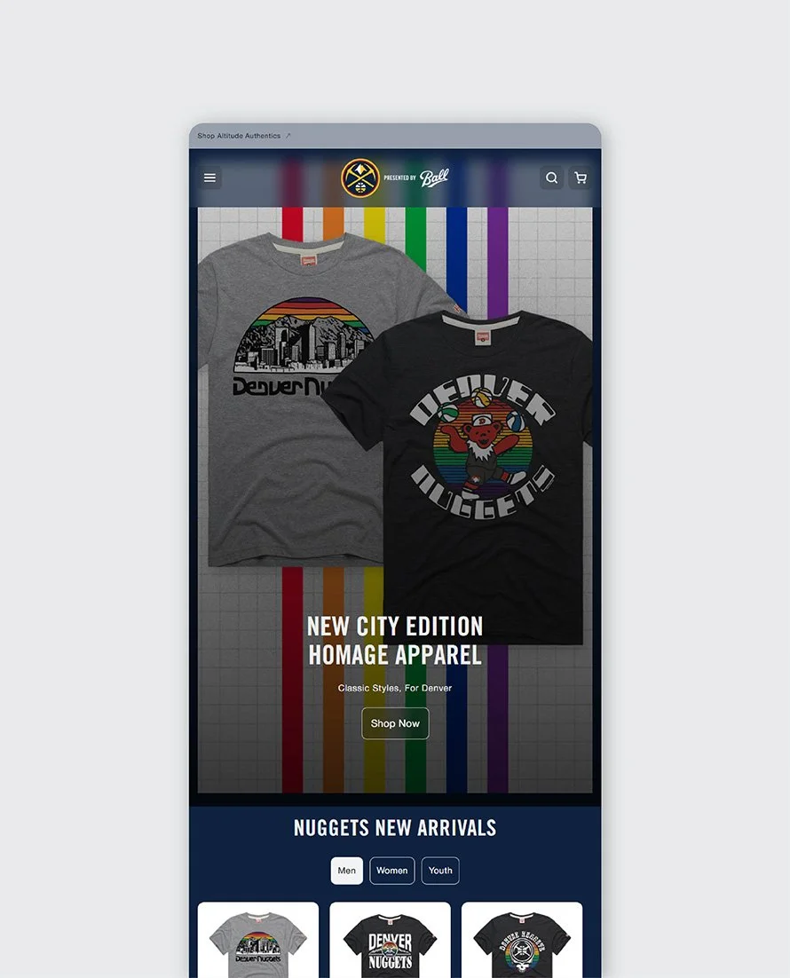 For the Denver Nuggets’ City Edition Homage collection, I created a variety of campaign assets built specifically around the team’s limited-edition visual identity. Instead of relying on their standard season branding, I aligned every deliverable with the unique colors, typography, and storytelling of the City Edition system. This included social media graphics, in-arena videoboard visuals, and cohesive ecommerce assets for the Nuggets’ official gear store. The final campaign delivered a unified, City Edition–driven experience that highlighted the collection’s personality across every platform.